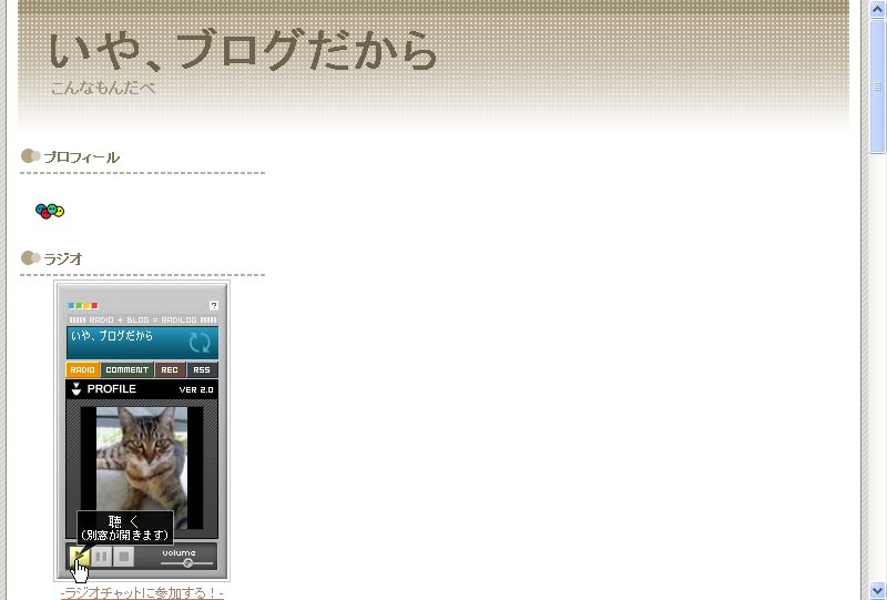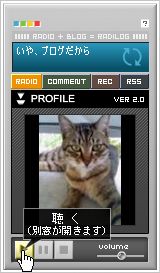 ネトラジをやりつつ、ブログもやろうかと。 ネトラジ+ブログをやれば、記事のコメントに対してあーだこーだ言ったりできますし。 場所を移動して、ネトラジをやるってだけですけどね^^; グダグダなネトラジですが、聴いていただけると嬉しいです(^-^) 放送開始時刻は、毎晩9時半~10時くらい。 終了時刻は、1時半~2時くらいです。 尚、放送時間帯が前後することもあります。 して、休日は気が向いた時に放送する予定です。 ここから放送を(放送中なら)聴けます。 http://skype.radilog.net/ ↓拡大 この再生ボタンをポチッとなw
